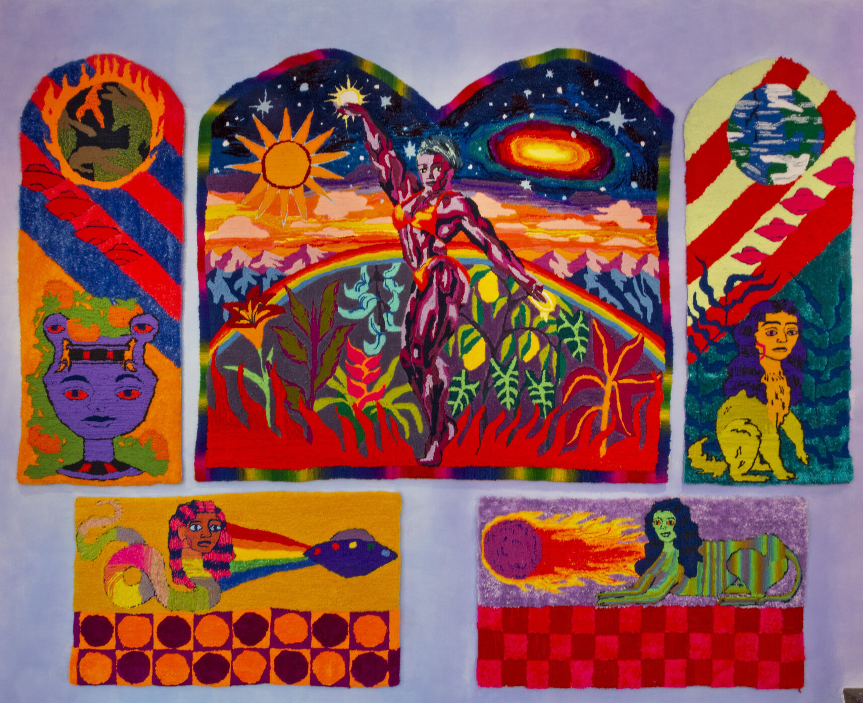 Installation with hand-tufted rugs, video, hand-dyed fabric on found furniture, candles, incense, digital prints on satin, and fluid acrylic
