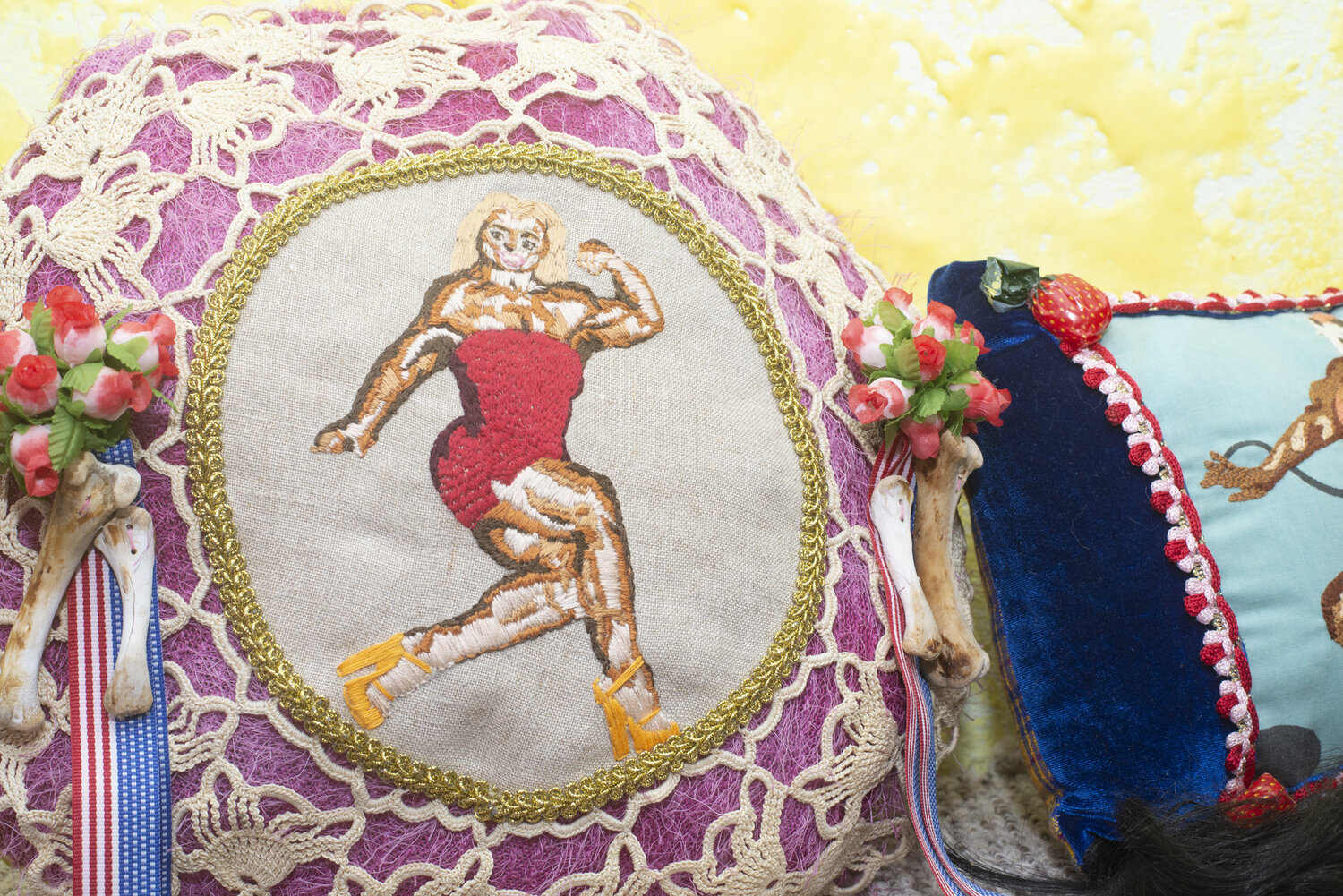 hand-embroidered pillows, puff paint, sequins, found objects, carpeting