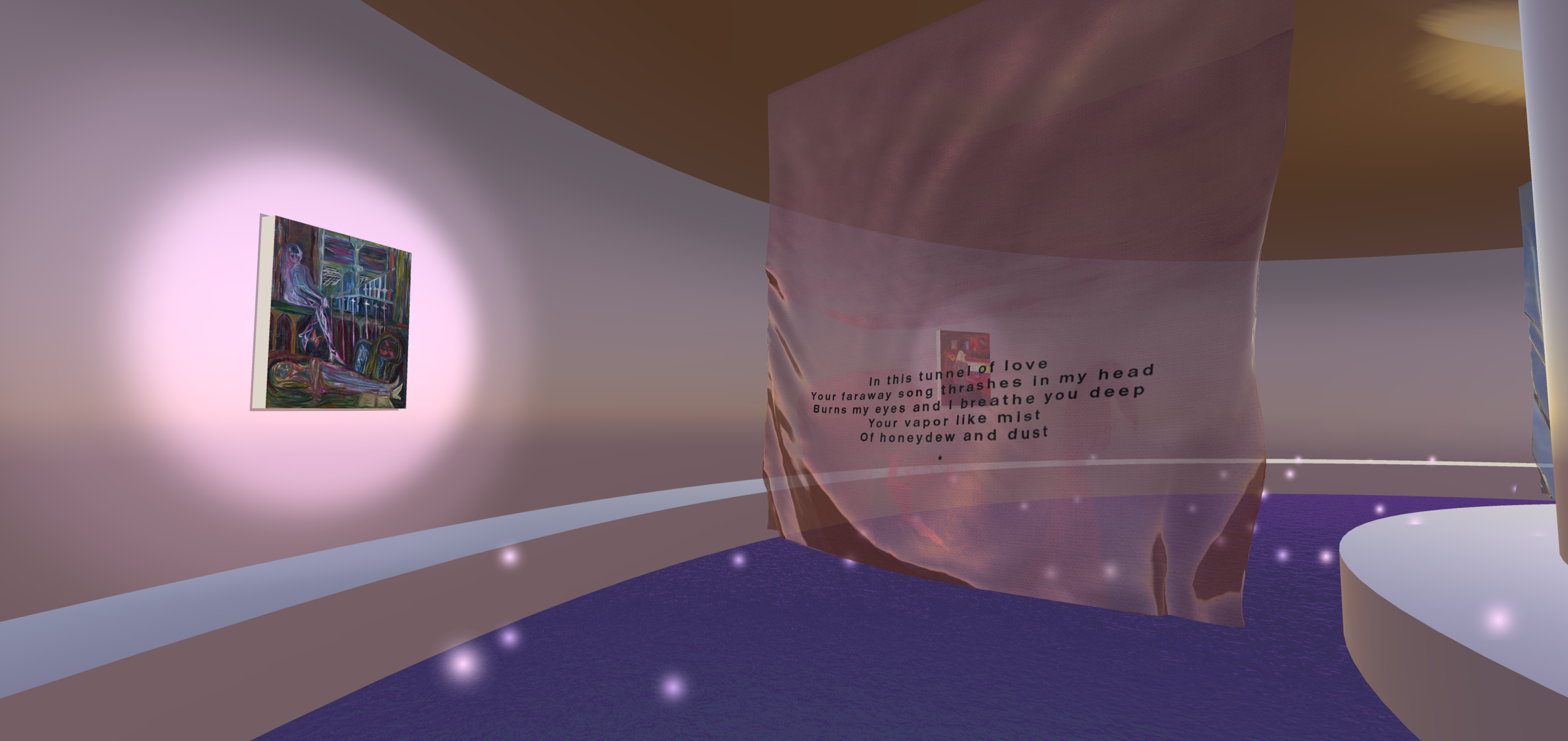I wanted the text, which I thought about as poems, to almost operate like reverb. I wanted them to operate like a faraway song that you heard, you know, like out of your car window, because you can't quite see the totality of the poems themselves as you’re moving through the virtual space, but maybe you remember a few of the sentences and they create an aura.