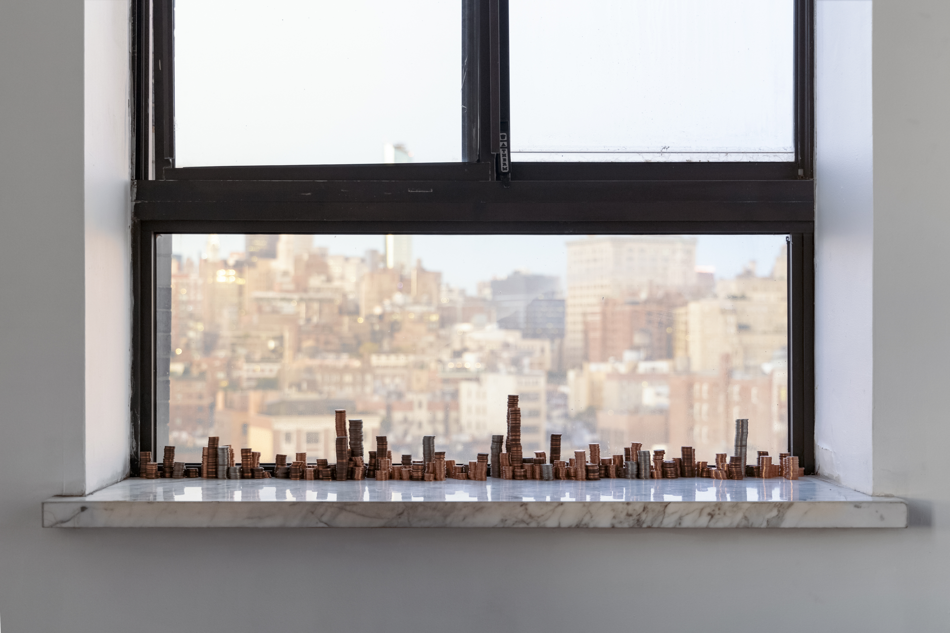 Actually, that’s from after I moved to New York in 2014, but yeah I’d consider that to be a part of this earlier body of work. Right before that, in 2013, I had a solo show in LA and that was my first moment of “okay, I’m making sculpture now, fully.” Then I moved to New York. I was a professional driver for a year and a half. Driving 8-12 hours a day… you end up with alot of thinking time. But it also created this weird micro-vascular relationship with the city. I would end up at the base of the World Trade Center multiple times a day, but then I would go out as far as Connecticut. My income was following the rhythm of the nine to five grind. Seeing the city up close and from far away every day, began to feel like a pulse. I also became hyper-aware of where capital was accumulating in the city, and the trail of it. The penny work is related to that experience.