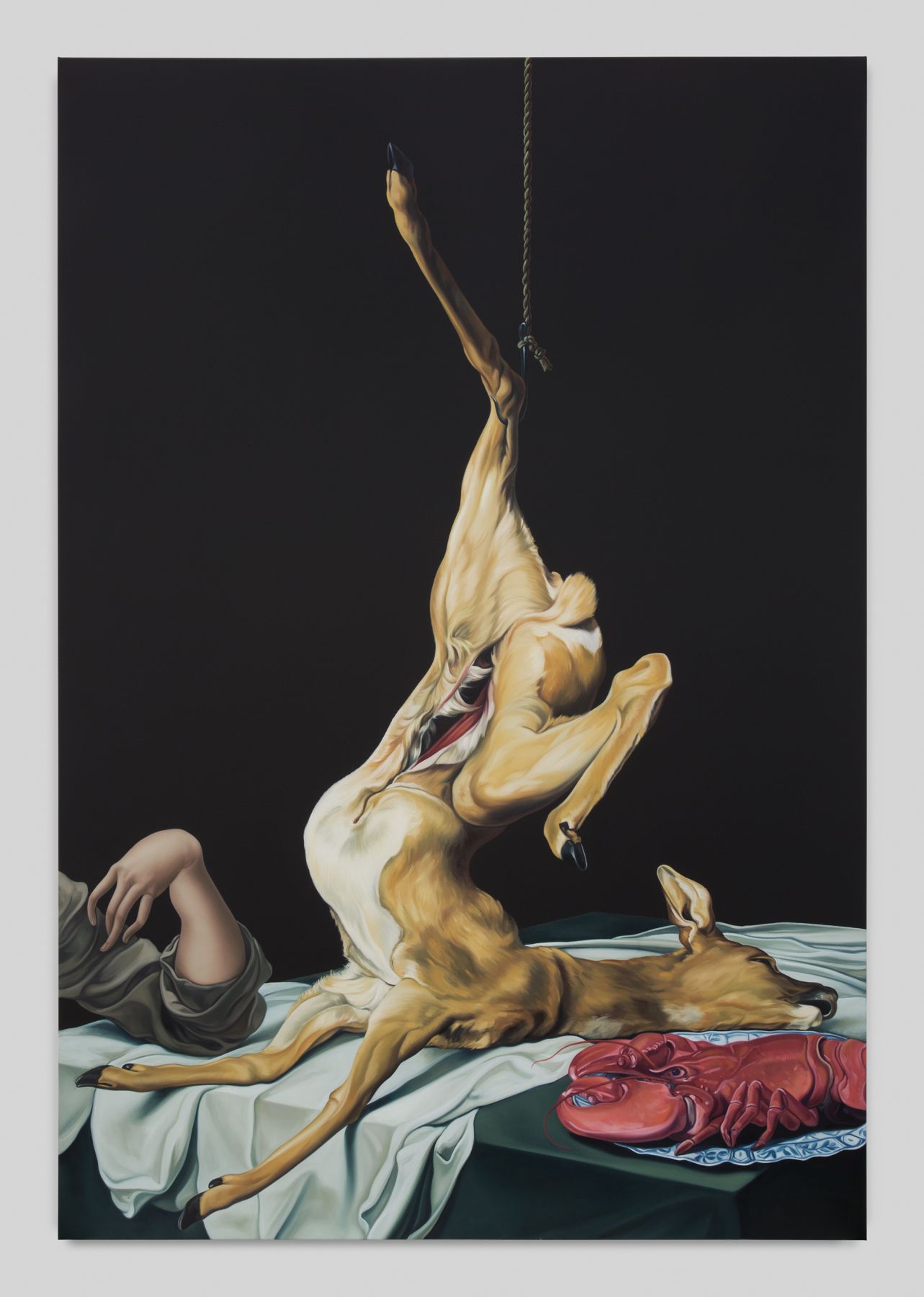 A lot of your earlier paintings are very still portraits against black backgrounds, and what you're doing now has a ton of action and violence. But there's a moment in between that, with something like, “The Enjoyable Lesson” (2016), with the ribbon around the dove’s neck, where it feels like there’s a moment of eeriness or tension or suspension, like the seconds just before action. Was it meant to be a suspenseful place?